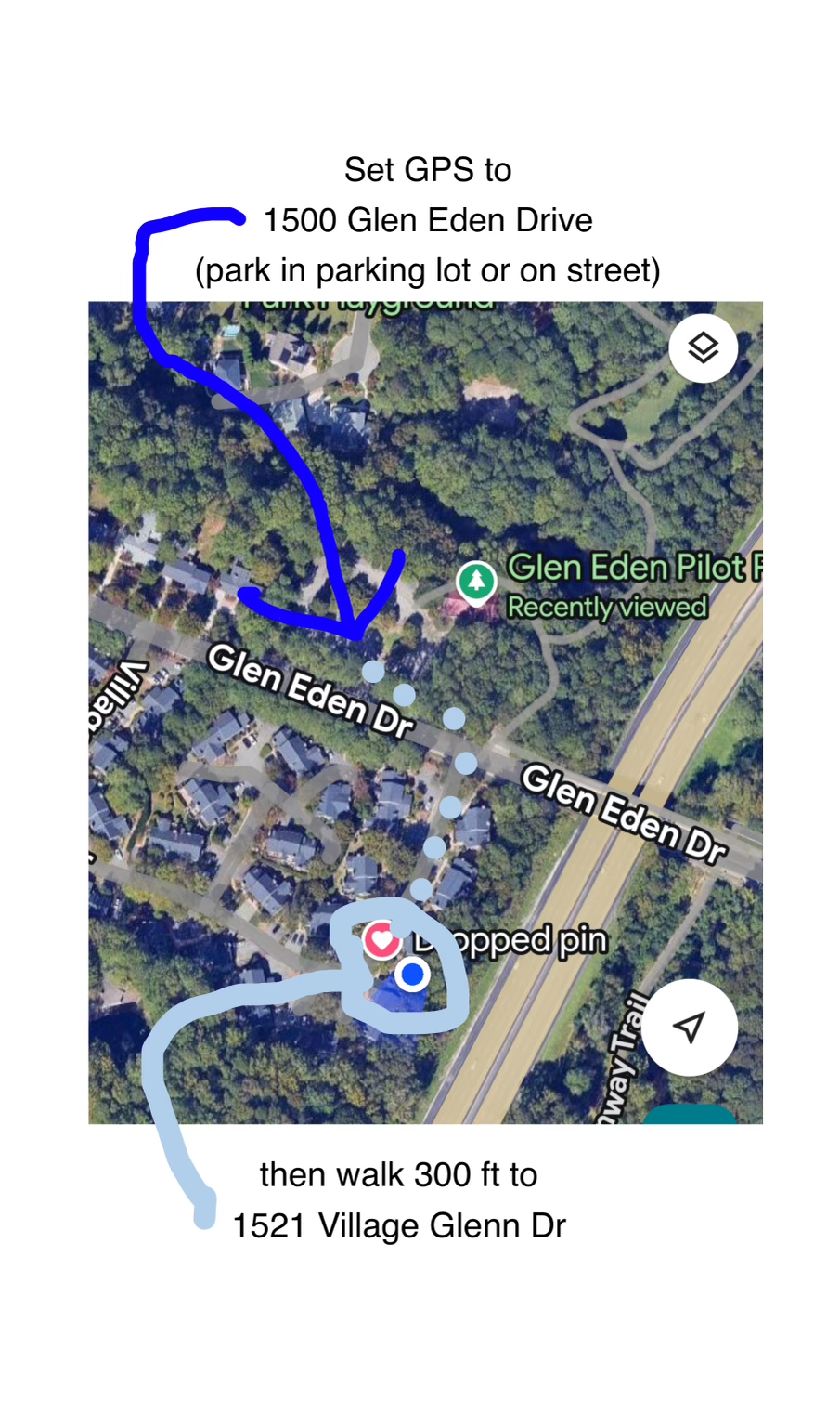 Park at 1500 Glen Eden Dr.